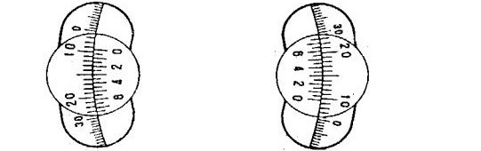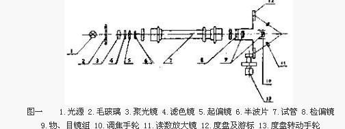 當(dāng)放進(jìn)存有被測(cè)溶液的試管后,由于溶液具有旋光性,使平面偏振光旋轉(zhuǎn)了一個(gè)角度,零度視場(chǎng)便發(fā)生了變化(如圖二a或c)。轉(zhuǎn)動(dòng)檢偏鏡一定角度,能再次出現(xiàn)亮度一致的視場(chǎng)。這個(gè)轉(zhuǎn)角就是溶液的旋光度,它的數(shù)值可通過(guò)放大鏡(10)從度盤(11)上讀出。