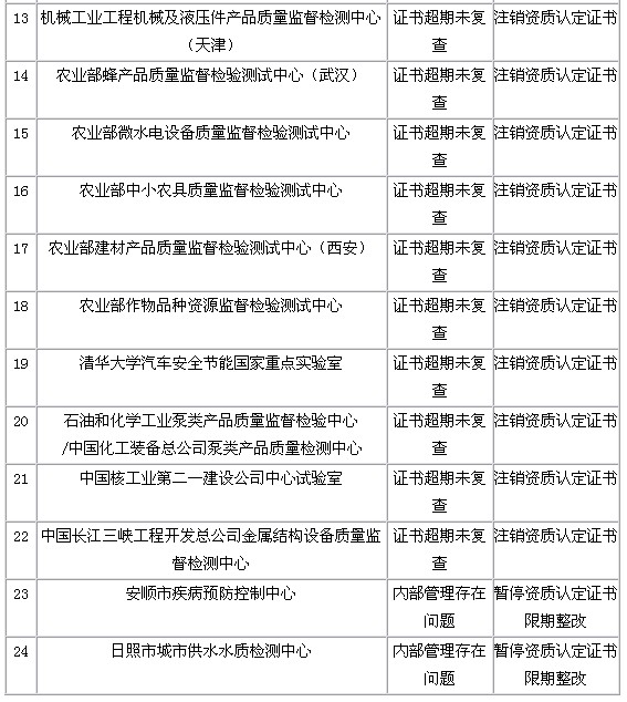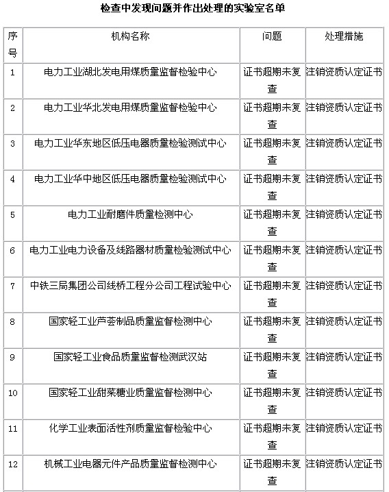 1.此次檢查發(fā)現(xiàn)了個別實驗室的質(zhì)量管理體系存在較大問題,部分實驗室證書到期未申請復(fù)查(名單見附件),將分別采取限期整改或者注銷資質(zhì)認(rèn)定證書的處理措施。