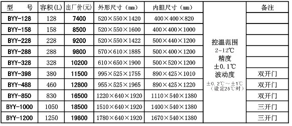 容積:380L;工作室尺寸:890×425×1010;控溫范圍、精度:+2℃ ~ +12℃;其他參數(shù):雙開門、聲光報警、自動除霜,高精度電腦控溫系統(tǒng)。